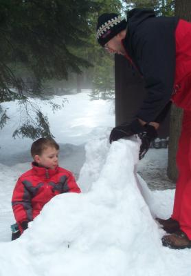 started a fine snowball fight from behind his defensive wall. Everything went fine until Bruce was hit by a real snowball. The literary description of such events can never match the awful reality of getting a heavy wet snowball right in the puss. |