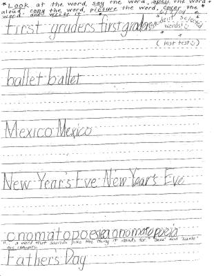 Here is the culmination of Bruce's first year of homework: the student-selected words for the last spelling test. Bruce's friend Ethan thought it would be funny to throw "onomatopoeia" in there for fun. That is beyond Daddy's ability, never mind first-graders! But Bruce nailed it -- way to go Brucie! | ||